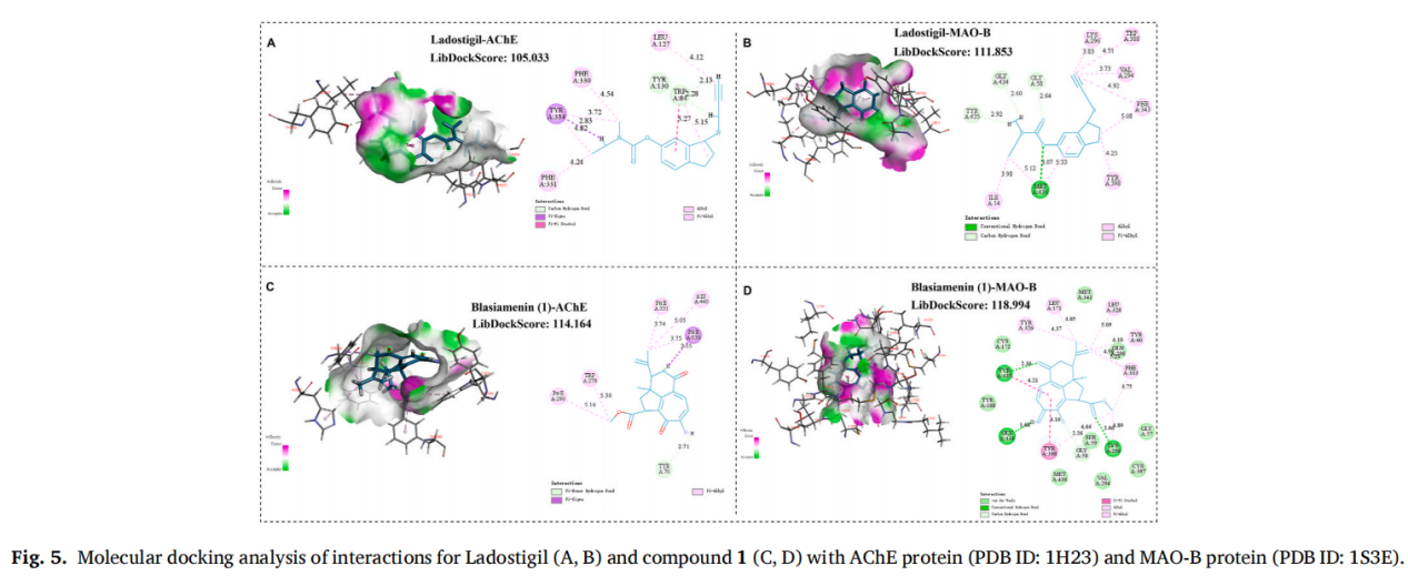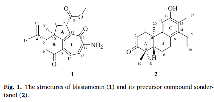 تم عزل ترايسكلو دينور-ديتيربينويد بلاسيامينين (1) ومكونه السلفي (2) غير موصوف سابقا من بلاخيا سيامنيسيس. تم تأسيس هياكلها بواسطة HRESIMS، وتقنيات الطيفية، خاصة حسابات ECD وحسابات الرنين المغناطيسي النووي باستخدام تحليل DP4+ ل 1. أشارت نتائج الالتحام الجزيئي للمركب 1 إلى أنه قد يكون له تثبيط محتمل ل AChE وMAO-B. كان 1 يمتلك نفس هيكل ترايسيكلو 5/6/7 مثل الديتيربينويدات الطبيعية من Strophioblachia fimbricalyx، وهو نبات مرتبط ارتباطا وثيقا من حيث الارتباط الجيني البيولوجي وبيئة النمو. قد تعزز ظروف درجات الحرارة العالية والضوء القوي في هاينان حدوث تفاعلات انقسام الحلقات للمركبات ذات البنية الثلاثية الكيتو، مما يؤدي إلى إنتاج مجموعة غنية من المستقلبات ذات الهياكل الكيميائية والتكوينات المجسمة المتنوعة.