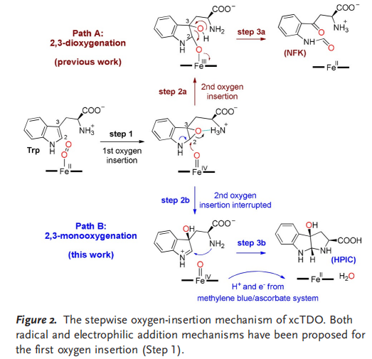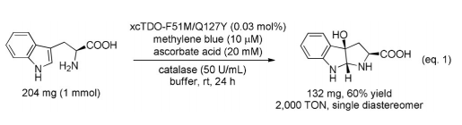 في الختام، من خلال تقييم آلية إدخال الأكسجين التدريجي لديوكسيناز التربتوفان والاستفادة من التطور الموجه، أوقفنا عملية إدخال الأكسجين المزدوج وحولنا إنزيم xcTDO تريبتوفان ديوكسيجيناز إلى أحادي الأكسجين. يظهر xcTDO الهندسي لدينا قدرة TON ممتازة وانتقائية دياستيريو عالية، ويمكن من توليف HPICs من Trps في خطوة واحدة قابلة للتوسع في التركيب. حسب علمنا، هذا هو أول إنزيم يمكنه تحفيز الدورة التأكسدية لتربيدات التريب غير المحمية بطريقة شديدة الانتقائية الطبقية، وهي عملية لم تتحقق صناعيا من قبل. تم تحديد بقايا F51 على أنها حاسمة في تحديد توزيع منتجات HPIC/NFK ونشاط الإنزيم. علاوة على ذلك، لا تتطلب عمليات التفاعل والتنقية لدينامذيبا عضويا، مما يجعل هذه الطريقة صديقة للبيئة لتصنيع مركبات HPIC لتطبيقات لاحقة.